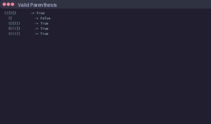 defcheck(s):stack=[]forelementins:ifelement=='(':stack.append(')')elifelement=='[':stack.append(']')elifelement=='{':stack.append('}')elifnotstackorstack.pop()!=element:returnFalsereturnnotstacktests=['()[]{}','(]','([{}])','{[()]}','((()))']fortintests:print(f'{t:12} -> {check(t)}')