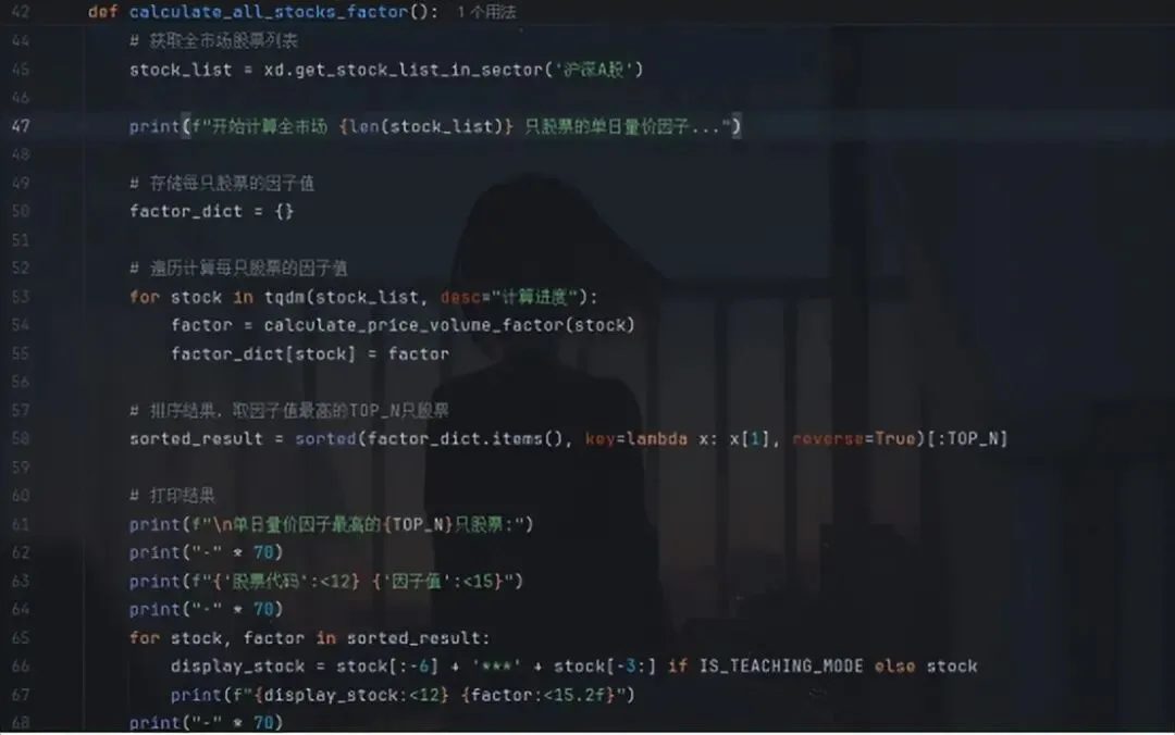 我们来看因子计算代码:这段代码的作用就是计算全市场沪深A股的单日价量趋势,再筛选出因子值最大的只。首先是设定全局变量:筛选最大50只,教学模式给股票代码打码以及获取当前日期。