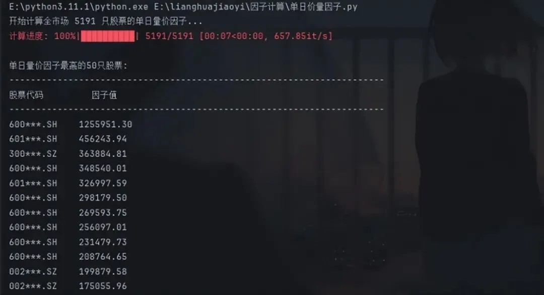 最后就是用QMT的接口获取全市场股票代码,再把股票代码作为计算因子的参数,从而实现计算全市场因子值。