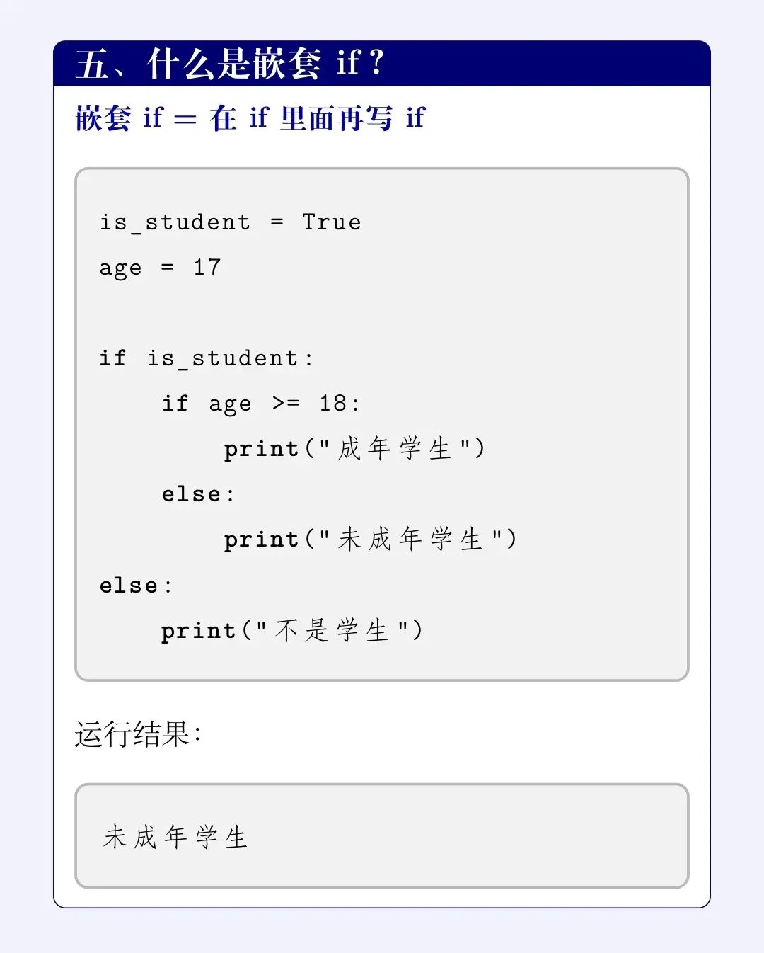 👉 嵌套 if 让程序具备“层次化思考能力”。