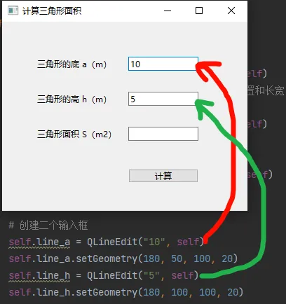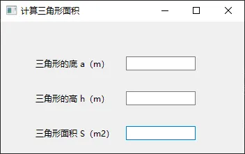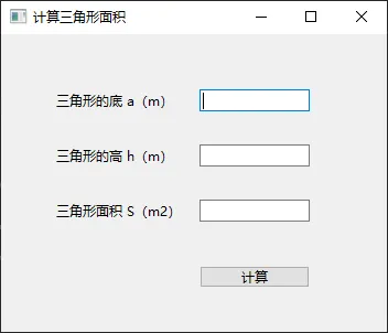 from PySide6.QtWidgets import QApplication, QWidget, QLabel, QLineEdit, QPushButtonclass Area(QWidget): # 创建名为Area的类 def __init__(self): # 创建类后先初始化 (固定写法) super().__init__() # 继承父类QWidget (固定写法) self.setWindowTitle("计算三角形面积") #设置窗口标题 self.resize(350, 270) # 设置窗口尺寸为(宽350px,高270px) self.ui_01() # 执行名字为 ui_01 的实例方法 def ui_01(self): # 创建 ui_01 实例方法 # 创建二个标签,三角形的 底、高 # 创建标签 self.lael_a self.label_a = QLabel("三角形的底 a(m)", self) self.label_a.setGeometry(50,50,120,20) # 创建标签 self.label_h self.label_h = QLabel("三角形的高 h(m)", self) self.label_h.setGeometry(50,100,120,20) # 创建标签label_s————展示三角形面积 self.label_s = QLabel("三角形面积 S(m2)", self) self.label_s.setGeometry(50, 150, 120, 20) # 创建二个输入框,并设置位置和尺寸 self.line_a = QLineEdit(self) self.line_a.setGeometry(180, 50, 100, 20) self.line_b = QLineEdit(self) self.line_b.setGeometry(180, 100, 100, 20) # 创建一个计算按钮,并设置位置和尺寸 self.btn = QPushButton("计算", self) self.btn.setGeometry(180, 210, 100, 20)# 运行主程序代码 if __name__ == "__main__": app = QApplication() # 创建一个app主程序 win = Area() # 为主程序实例化一个窗口 win.show() # 显示窗口 app.exec() # app运行