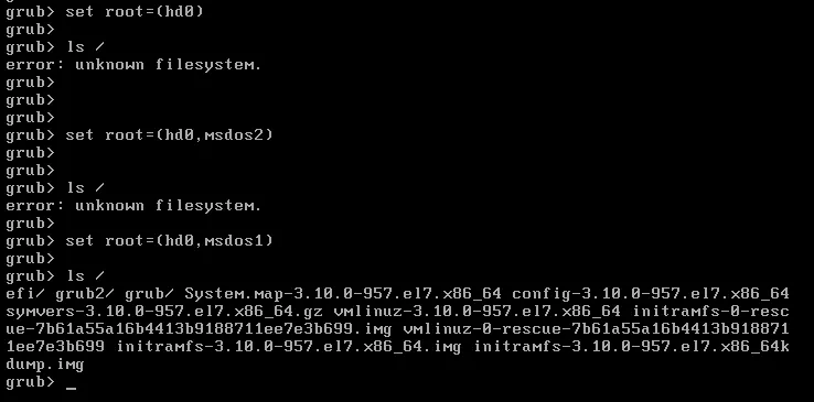 2> 执行ls /,查看输出中是否有内核相关文件(如vmlixxx、initraxxxx的文件)。如果没有,重复步骤1、2