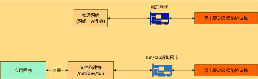 - TUN/TAP设备:在操作系统内部将内核网络协议栈与用户空间的应用程序相连接。一端连接应用程序,另一端连接网络协议栈。