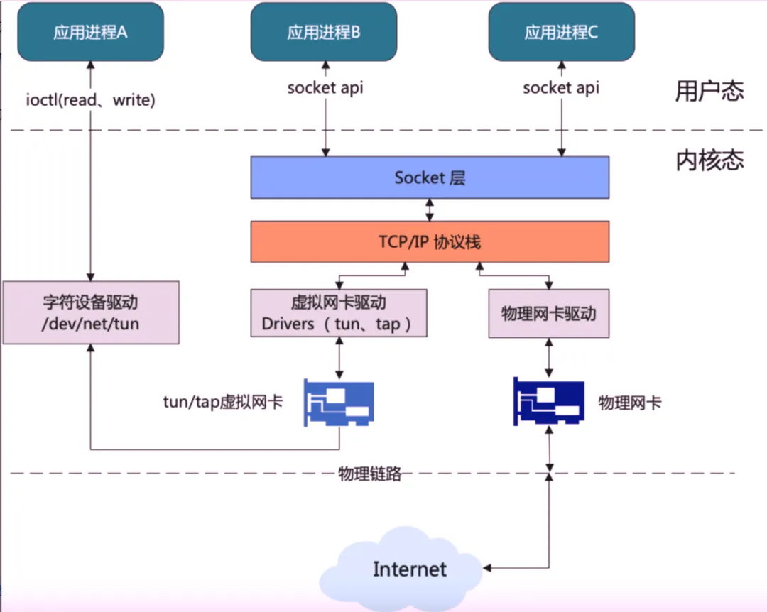 - 字符设备驱动部分则在内核与用户态之间传输网络分包,模拟物理链路的数据接收和发送。用户态程序通过 ioctl、read 和 write 系统调用与字符设备 /dev/net/tun 进行数据交互。
