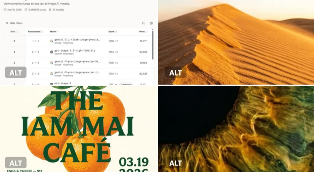 ● 在权威LMArena图像生成模型排行榜中,MAI-Image-2跻身全球第三,仅次于谷歌gemini-3.1-flash-image-preview、OpenAI的gpt-image-1.5-high-fidelity,较初代MAI-Image-1(初始排名第九)实现大幅跃升。