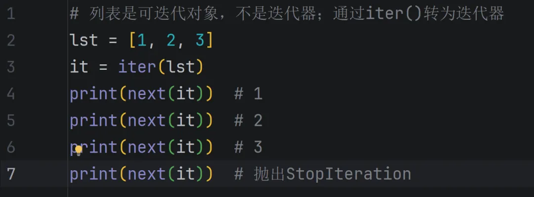 定义:实现了iter()和next()方法的对象(iter返回自身,next返回下一个元素,没有元素时抛出StopIteration异常)。
