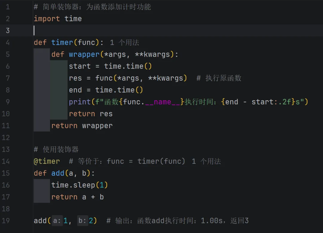 定义:一种“函数包装器”,本质是高阶函数(接受函数作为参数,返回一个新函数),用于在不修改原函数代码的前提下,为函数添加额外功能(如日志、计时、权限校验)。