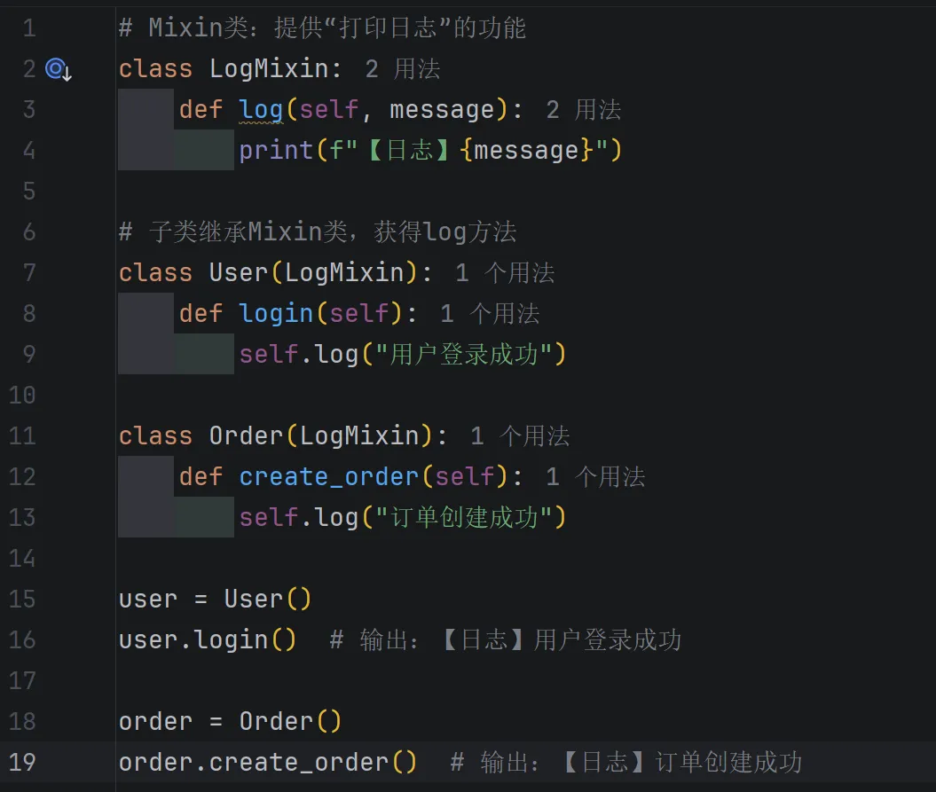 核心特点:不单独实例化,只作为“混入”,通过多继承的方式,让子类获得Mixin类的方法。
