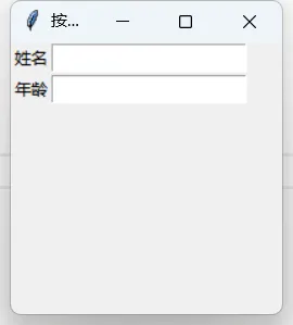 Entry组件是 Tkinter 中的单行文本输入框,用于接收用户输入的字符串、数字等单行内容,常和 Label 搭配使用做表单界面。import tkinter as tk #以别名tk导入tkinter库win=tk.Tk() #创建主窗口的实例winwin.title("按钮组件测试窗口") #设置窗口的标题win.geometry("200x200+600+200")#设置窗口的大小和位置win.resizable(True,False) #设置窗口可水平缩放,禁止垂直缩放label1=tk.Label(win,text="姓名") #创建标签对象label1label1.grid(row=0,column=0) #布局管理器grid,将组件添加到主窗口的第一行,第一列label2=tk.Label(win,text="年龄")label2.grid(row=1,column=0) #第二行,第一列entry1=tk.Entry() #创建输入框组件对象entry1entry1.grid(row=0,column=1) #网格布局,放在标签对象label1后面entry2=tk.Entry() #创建输入框组件对象entry2entry2.grid(row=1,column=1) #网格布局,放在标签对象label2后面tk.mainloop() #进入事件处理循环,防止窗口闪退