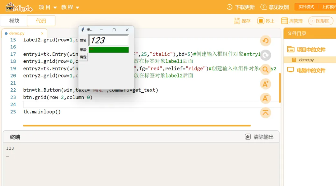import tkinter as tkwin=tk.Tk()win.title("按钮组件测试窗口")win.geometry("200x200+600+200")win.resizable(True,False)def get_text():#定义函数:调用get()方法获取文本中内容 text=entry1.get() print(text)label1=tk.Label(win,text="姓名")label1.grid(row=0,column=0)label2=tk.Label(win,text="年龄")label2.grid(row=1,column=0)entry1=tk.Entry(win,width=8,font=("黑体",25,"italic"),bd=5)#创建输入框组件对象entry1entry1.grid(row=0,column=1) #网格布局,放在标签对象label1后面entry2=tk.Entry(win,show="*",bg="green",fg="red",relief="ridge")#创建输入框组件对象entry2entry2.grid(row=1,column=1) #网格布局,放在标签对象label2后面btn=tk.Button(win,text="确定",command=get_text)btn.grid(row=2,column=0)tk.mainloop()