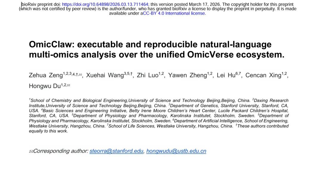 2026年,该团队在BioRixv发表预研版本,OmicClaw,对应的是OmicVerse v2版本。
