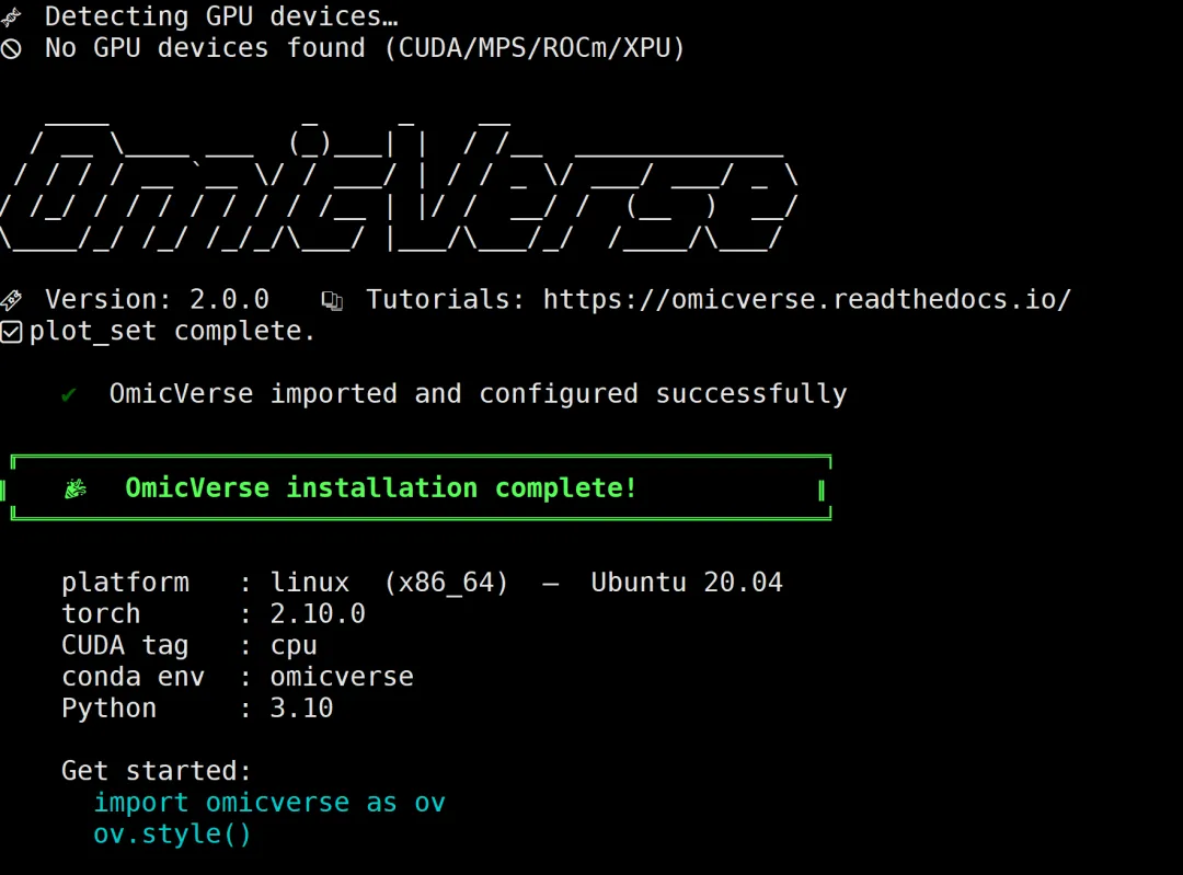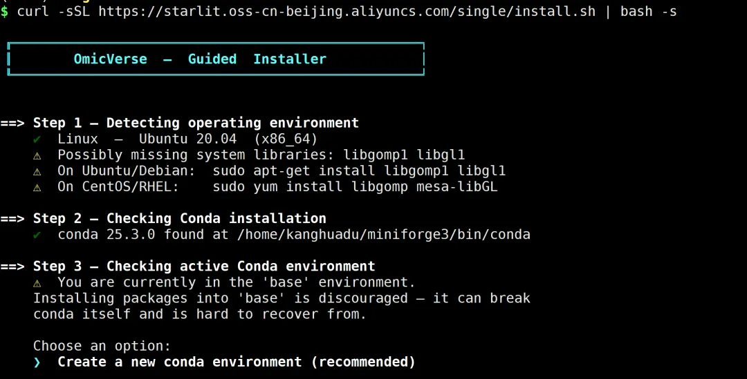 # 仅适用于 Linux(国内加速)curl -sSL https://starlit.oss-cn-beijing.aliyuncs.com/single/install.sh | bash -s该脚本会自动: - 设置适当的环境 - 为您的系统安装正确的 PyTorch 版本 - 安装所有必需的依赖项 - 为您的硬件优化配置 OmicVerse