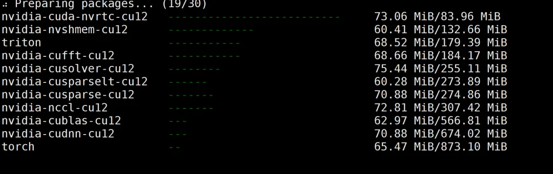 # For CUDA support (check your CUDA version with 'nvcc --version')conda install pytorch torchvision torchaudio pytorch-cuda=11.8 -c pytorch -c nvidia# OR for CPU-only installationconda install pytorch torchvision torchaudio cpuonly -c pytorch# Install PyTorch Geometricconda install pyg -c pyg安装速度,取决你的网速,需要下载大量的数据。我们使用的是西柚云的服务器,下载速度在15-20Mb/s,春节期间,可领取200元立减券:西柚云服务器立减优惠活动,或输入优惠码:BioinfoDu。
