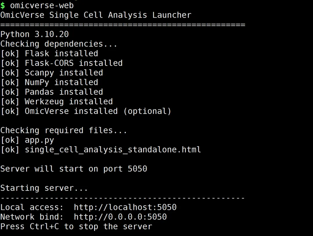 omicverse-web服务默认在 http://localhost:5050 启动(端口被占用时自动顺延至 5051、5052 …)。看到以下输出即表示启动成功: