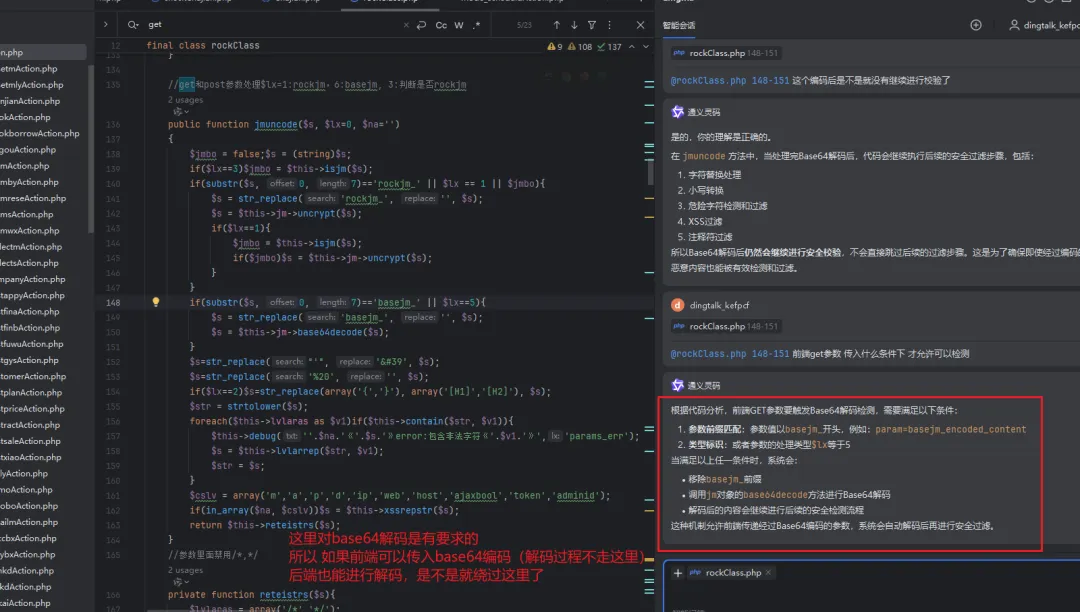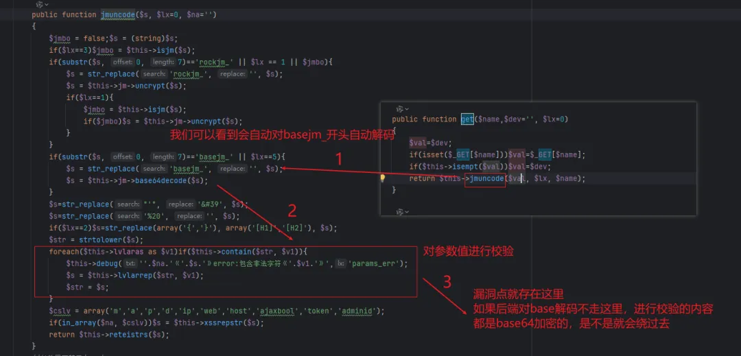 这个有意思,在封装get方法传参的过程中,会对base64进行解码(但是有条件,参数值需要以basejm_ 开头),然后对解码后的内容进行检查是否存在xss,sql注入等。<br/>但是某些前端输入的参数是base64编码,但是不要求是basejm_开头,会在传入参数之后,走完封装的get方法之后再进行base64解码。<br/>这样的话,前端传入到这个get封装的方法的时候没有满足解码要求,没有进行base64解码,get检测就是base64的内容,就会绕过检测,从而导致sql注入。<br/>信任没有完全覆盖。