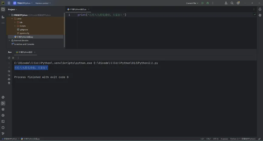 运行这段代码,Python就会乖乖地说:你好,世界!小伙伴们,打开你手中的瑞士军刀——PyCharm,我们一起开始啦。首先,我们教Python给兄弟们问声好,让Python说出“石有八九的兄弟们,大家好!”众所周知,我们是通过嘴巴说话的。那么,Python也得有嘴巴吧,大伙说对不对?教Python说中文
