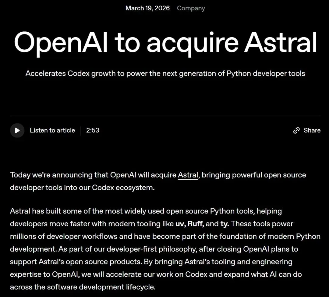2026 年 3 月 19 日,一则消息在开发者社区炸开了锅——OpenAI 宣布收购 Astral,这家专注于 Python 开发工具的明星初创公司。交易完成后,Astral 团队将全部并入 OpenAI 的 Codex 团队。