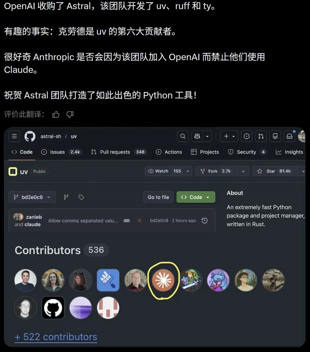 这次收购还有一个有趣的背景:Anthropic 的 Claude 已经是 Astral 项目的重要代码贡献者。