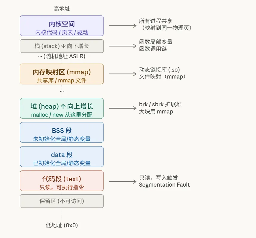 进程的虚拟地址空间从低到高依次是:保留区、代码段、数据段、堆、内存映射区、栈,最上面是内核空间。每个区域都有各自的用途和权限。