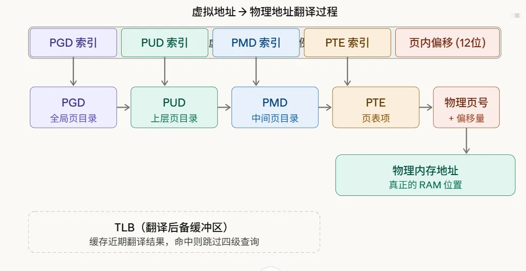 Linux x86-64 采用四级页表(PGD → PUD → PMD → PTE),每次地址翻译最多需要四次内存访问。为了提速,CPU 里有一个 TLB(Translation Lookaside Buffer) 缓存最近的翻译结果,命中时直接得到物理地址,完全跳过四级查询。