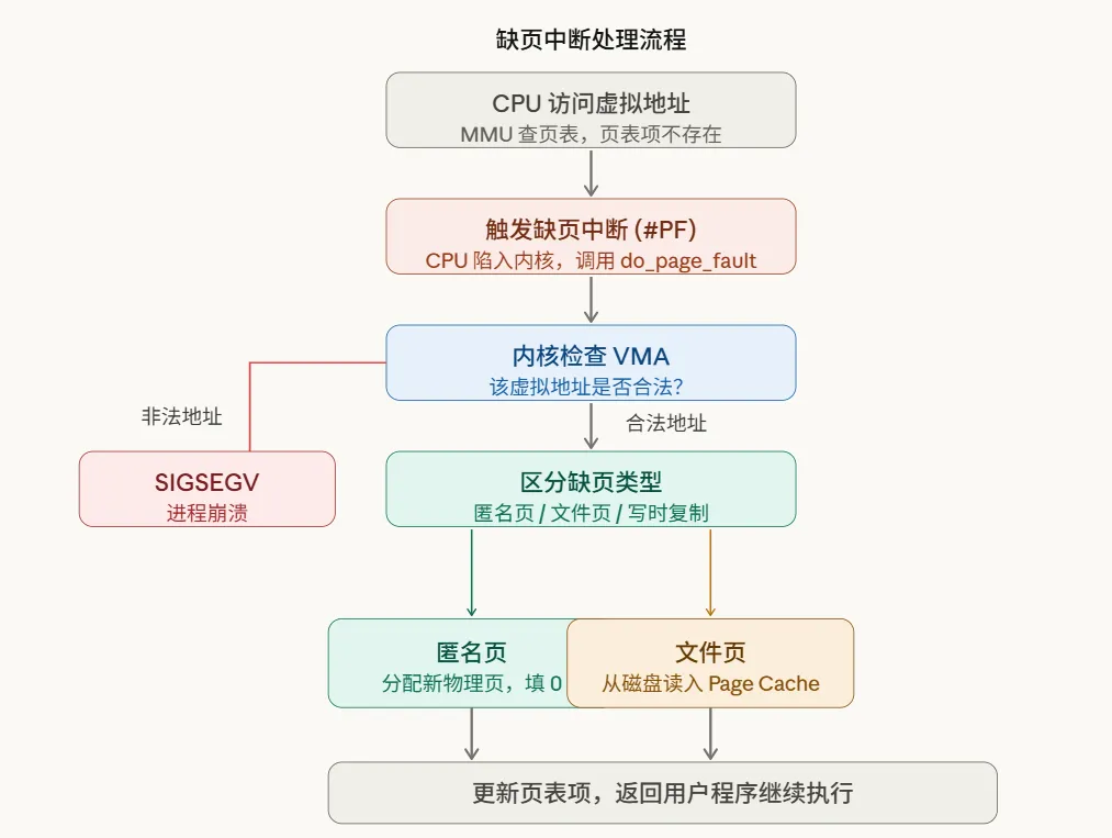 char *p = malloc(1024 * 1024 * 1024); // 只分配虚拟地址,物理页未分配p[0] = 'A'; // 第一次写入:触发缺页中断!内核才真正分配物理页p[1] = 'B'; // 这个物理页已存在,直接写入缺页中断的完整流程如下: