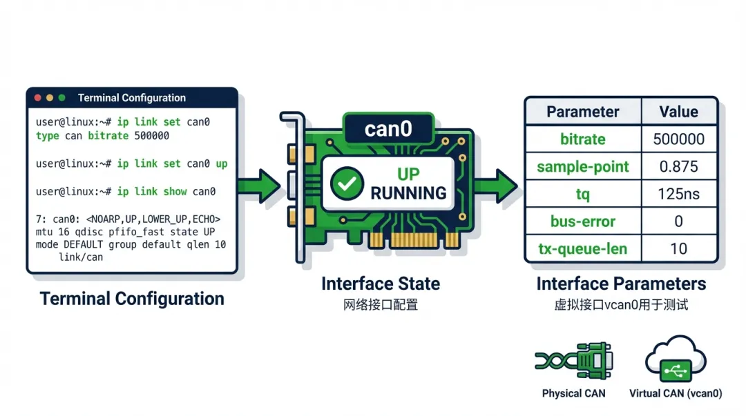 ▲ ip link 配置 CAN接口——设置波特率、启动接口、查看接口状态的完整流程