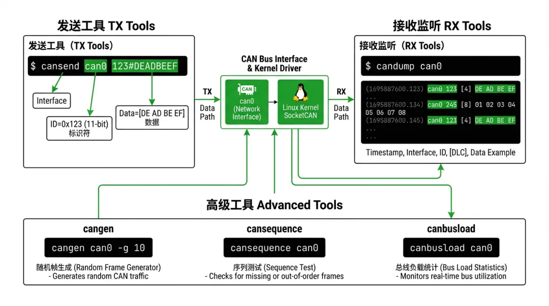 ▲ can-utils 工具链全景——发送、接收、压力测试一套工具搞定 CAN 总线调试