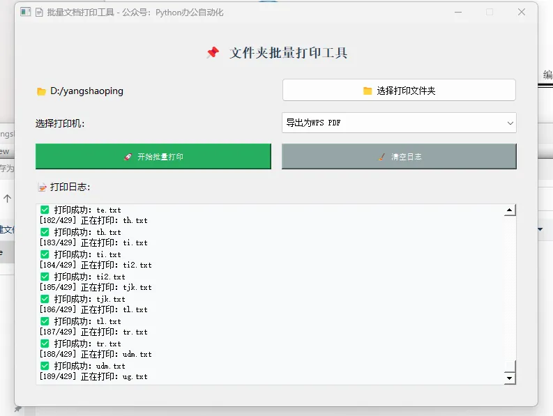 ✅ 可视化GUI界面,操作零门槛 ✅ 自动遍历文件夹内所有文档(PDF/Word/TXT) ✅ 读取系统所有打印机,自由切换 ✅ 实时显示打印日志,清晰掌握进度 ✅ 支持一键启动、一键清空日志 ✅ 适配Windows/macOS双系统,无需安装额外驱动