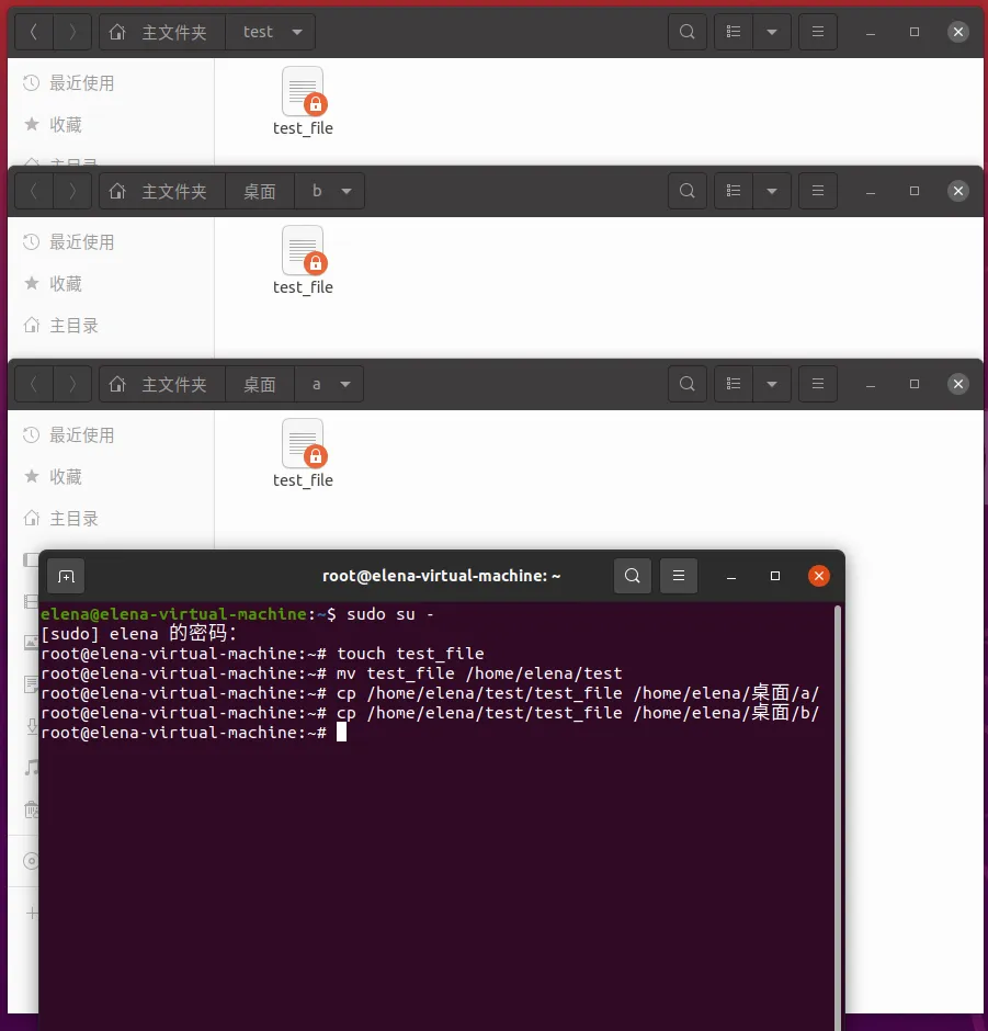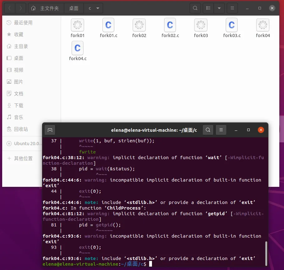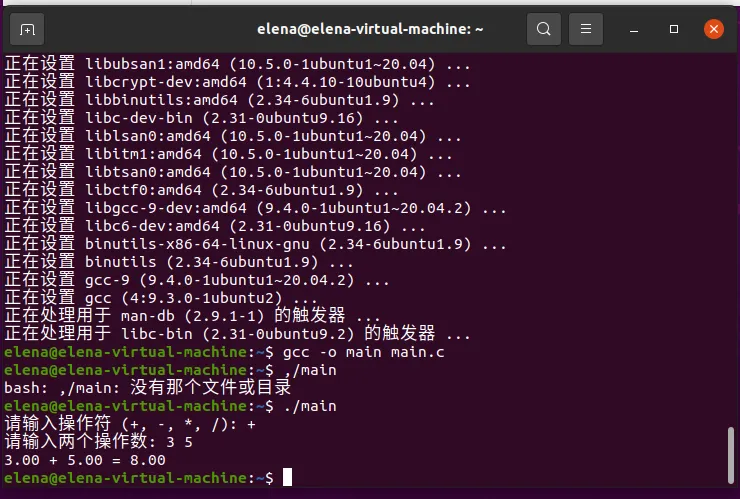 一. 实验目的 了解Linux系统,熟悉Linux系统基础操作 了解Linux系统下C语言程序的编写和编译过程 了解Linux系统下的编译工具Make 理解fork函数的使用,掌握如何创建子进程。 理解wait函数的功能,掌握如何等待子进程结束。 二. 实验环境及材料 2.1 硬件环境配置 CPU: 13th Gen Intel(R) Core(TM) i9-13900HX,4核(每个核1个线程),基础频率2419.200 MHz,L1缓存:192 KiB(数据),128 KiB(指令);L2缓存:8 MiB;L3缓存:36 MiB。 内存: 总计1.9 GiB,已用959 MiB,空闲98 MiB,缓冲/缓存870 MiB,可用808 MiB。 硬盘: 总容量: 20 GiB 分区: /boot/efi:512 MiB /:19.5 GiB 挂载点: /media/elena/Ubuntu 20.04.2.0 LTS amd64(光盘驱动器,2.7 GiB) 2.2 软件名称、版本号及参数配置 操作系统: Linux 仿真软件: VMware Workstation 17Pro 三. 实验内容 3.1 实验设计 1.装机:参考以下两个网站,完成VMware Workstation 17Pro虚拟机的安装,并在虚拟机安装Ubuntu20.04 https://zhuanlan.zhihu.com/p/685829787https://blog.csdn.net/qq_45657288/article/details/116084337 2.熟悉Linux系统常用命令:15条基本操作语句 3.在Linux系统下尝试编写和编译C语言程序:编写一个简单的C程序,并用gcc命令执行 4.使用Linux系统下的编译工具Make:编写头文件greeting.h,自定义函数greeting.c,主函数myapp.c构成的C程序,根据这三个文件的依赖关系编写Makefile文件 5.编写并编译实验2代码示例。运行程序并观察输出,理解 fork 和 wait 的行为;分析程序输出,验证父子进程的工作独立性。 3.2 实验实施 3.2.1 Linux系统基础操作 参照网站,完成虚拟机以及Ubuntu安装,测试网络,成功ping通,表示已正常安装。 下图是装机成功后画面, 输入设定的用户密码后进入系统,显示桌面。