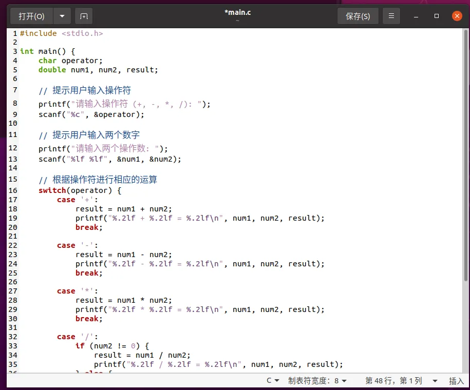 此时我们已经进入到main.c文件上面,这时候我们可以去编写C语言了,下面写了一个C语言的简单加减乘除计算器。写完了之后点击保存。
