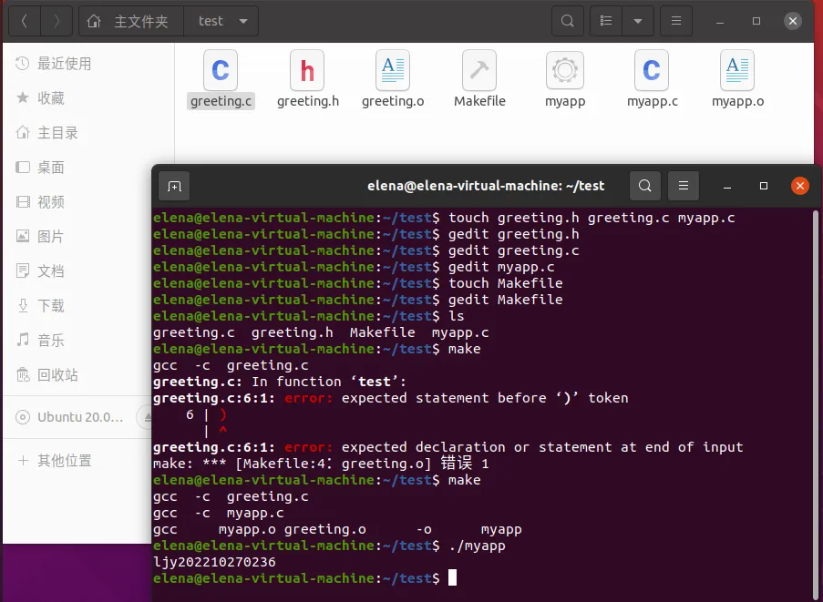 使用make和./myapp语句执行,可以看到执行结果(中间出现语法错误,打开调整即可)。