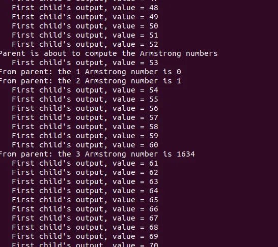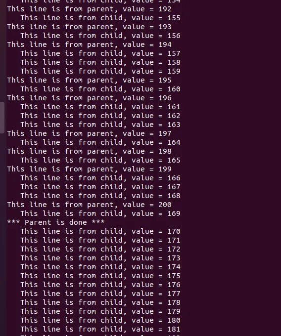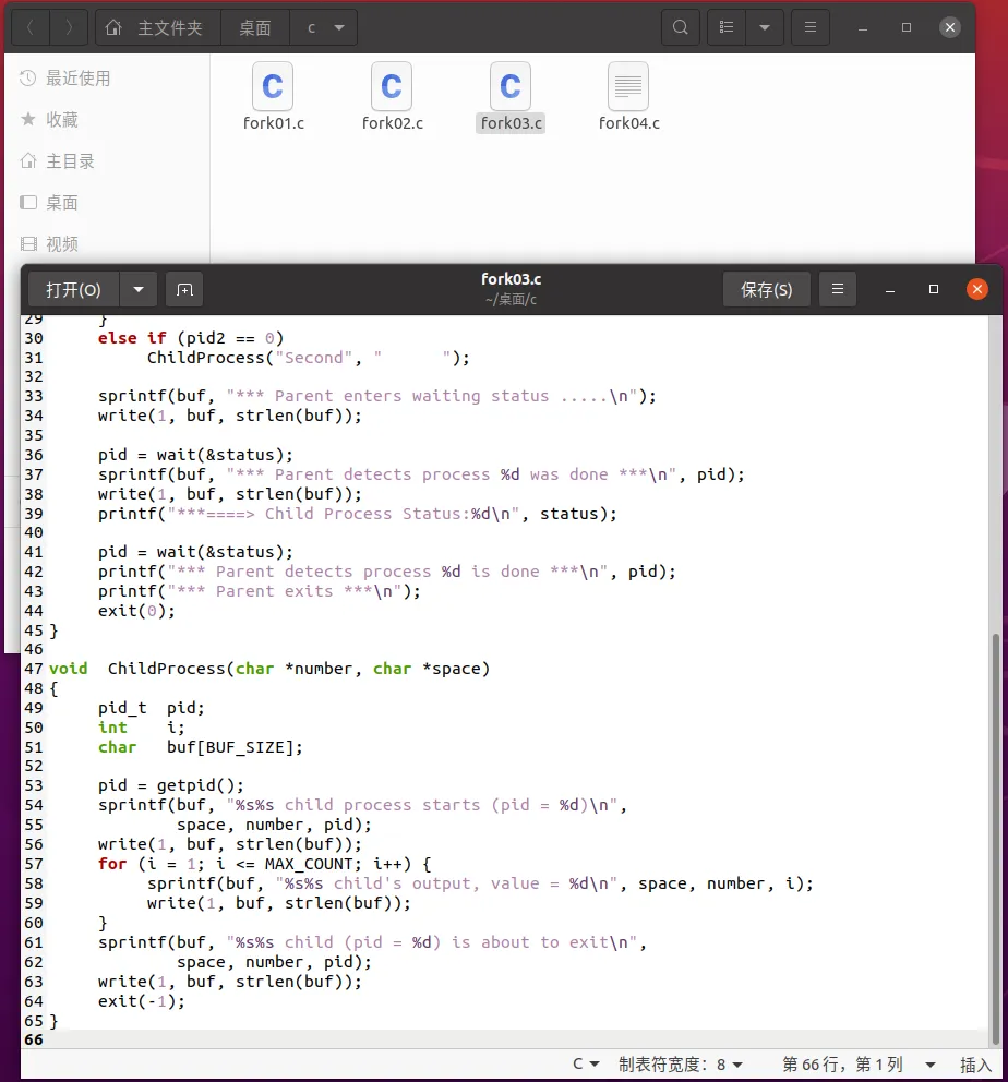 在此示例中,父进程和子进程被分配了不同的任务,分别由ChildProcess和ParentProcess函数执行。 输出表明,子进程和父进程的输出是交错的,显示了它们在执行过程中的并行性。 (3)fork03