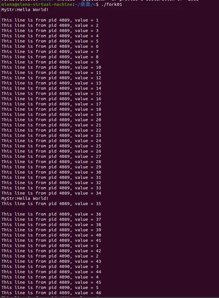父进程和子进程的地址空间在创建时是相同的,但对共享变量的修改(如MyStr)在父子进程中是独立的。 输出中可看到父进程和子进程的pid,以及它们各自输出的内容,这表明它们是独立执行的。 (2)fork02