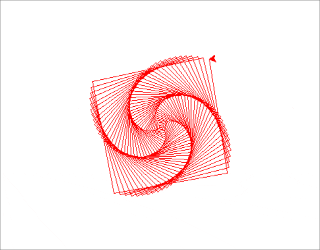 首先很明显,画笔是红色的,然后这些组成图形的线条一条比一条长,然后整个形状类似于一个不断变大的正方形,还有就是他执行了很多次,有类似动态的效果。