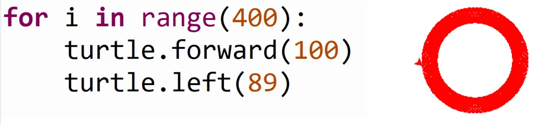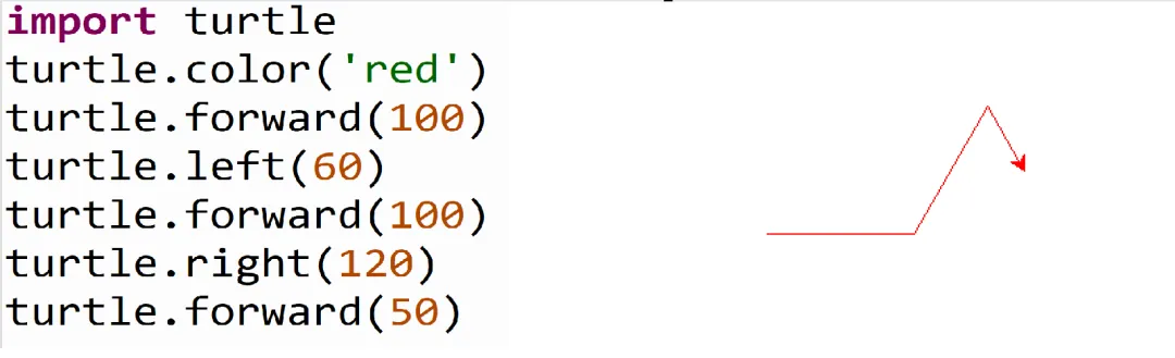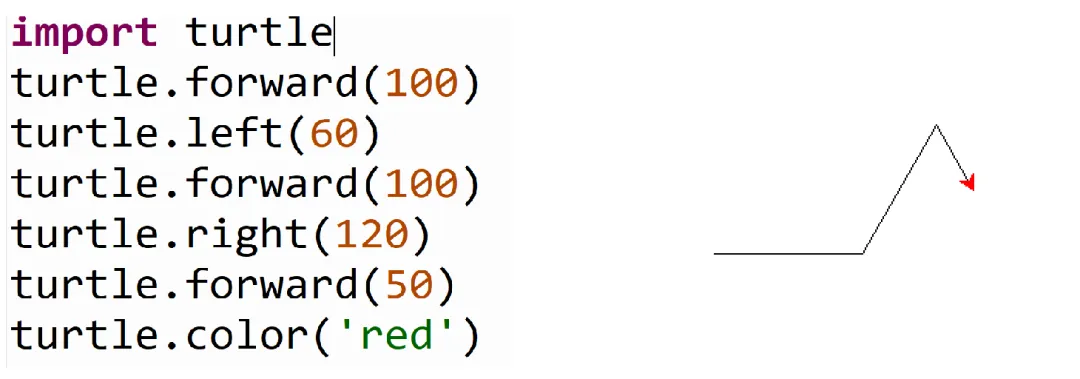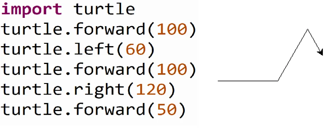 小括号里要写的就是转弯的度数了,那接下来各位同学可以自由的尝试一下, 让海龟前进和左转右转结合在一起,看看能不能画出有趣的图形。