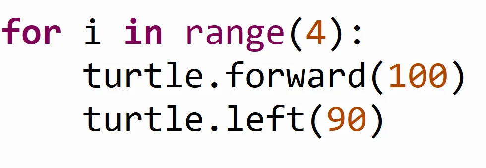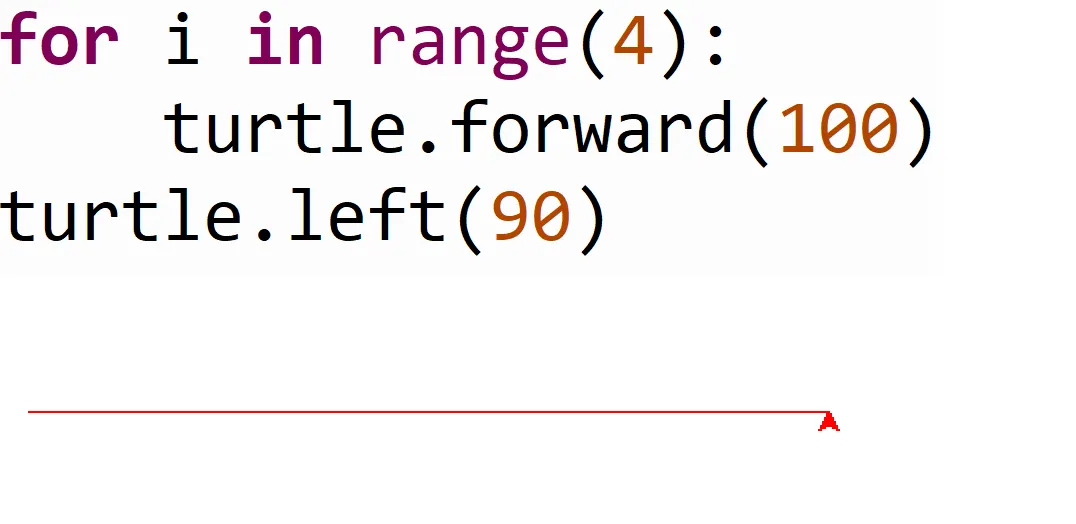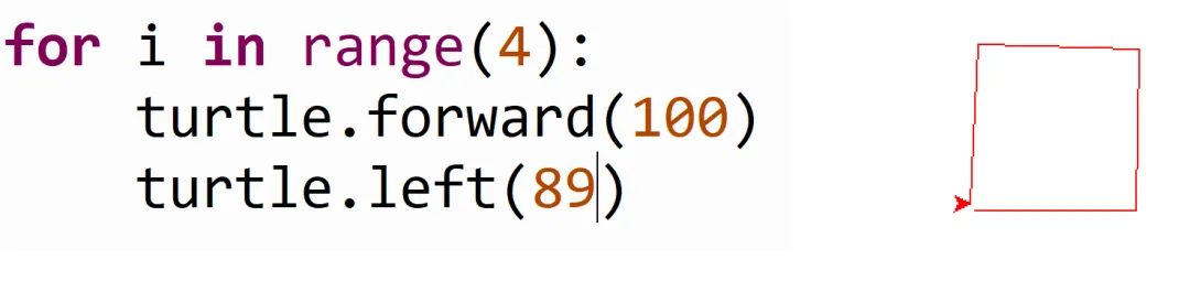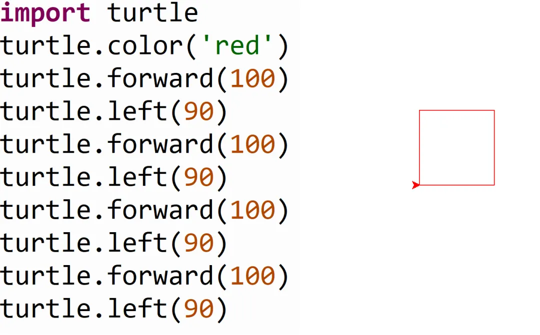 四条相同长度的边,每个角是90°,那么用画笔来画的话就需要前进100步,再左转90°,然后再前进100步,再左转90°。