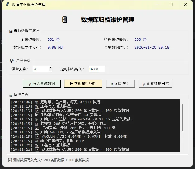 # ───────────────────────────────────────────── # 归档核心逻辑 # ───────────────────────────────────────────── defarchive_old_data( db_path: str, keep_days: int = 30, result_queue: queue.Queue = None, ) -> dict: """ 把 keep_days 天之前的数据从主表迁移到归档表,然后删除主表记录。 返回操作摘要字典,同时(可选)把进度推入 result_queue 供 UI 消费。 注意:此函数运行在独立线程,绝对不能直接操作任何 Tkinter 控件。 """def_notify(msg_type: str, payload): if result_queue isnotNone: result_queue.put((msg_type, payload)) cutoff = time.time() - keep_days * 86400 cutoff_str = time.strftime("%Y-%m-%d %H:%M:%S", time.localtime(cutoff)) summary = { "archived": 0, "deleted": 0, "vacuum_done": False, "error": None, "start_ts": time.time(), "end_ts": None, } _notify("progress", f"📦 开始归档:迁移 {cutoff_str} 之前的数据…") conn = sqlite3.connect(db_path) try: # ── 步骤 1:迁移旧数据到归档表 ────────────── # 先查一下要迁移多少条,给用户一个预期 count_row = conn.execute( "SELECT COUNT(*) FROM sensor_data WHERE ts < ?", (cutoff,) ).fetchone() to_archive = count_row[0] if count_row else0if to_archive == 0: _notify("progress", f"✅ 没有需要归档的数据(基准时间:{cutoff_str})") summary["end_ts"] = time.time() return summary _notify("progress", f"📋 共找到 {to_archive} 条待归档记录,开始迁移…") conn.execute(""" INSERT INTO sensor_data_archive (device_id, value, ts) SELECT device_id, value, ts FROM sensor_data WHERE ts < ? """, (cutoff,)) summary["archived"] = to_archive # ── 步骤 2:从主表删除已迁移的数据 ────────── result = conn.execute( "DELETE FROM sensor_data WHERE ts < ?", (cutoff,) ) summary["deleted"] = result.rowcount conn.commit() # 写维护日志 conn.execute( "INSERT INTO maintenance_log(op, detail, exec_ts) VALUES(?,?,?)", ( "archive", f"archived={summary['archived']}, deleted={summary['deleted']}, "f"cutoff={cutoff_str}", time.time(), ), ) conn.commit() _notify( "progress", f"✅ 归档完成:迁移 {summary['archived']} 条,"f"主表删除 {summary['deleted']} 条", ) # ── 步骤 3:VACUUM 压缩数据库文件 ──────────── # VACUUM 会独占锁库,期间所有其他连接阻塞。 # 必须在维护窗口执行,生产时段禁止调用。 _notify("progress", "🔧 开始 VACUUM,正在压缩数据库文件…") size_before = os.path.getsize(db_path) / 1024 / 1024# MB # VACUUM 不能在事务内执行,需要先确保没有未提交事务 conn.execute("VACUUM") size_after = os.path.getsize(db_path) / 1024 / 1024 saved = size_before - size_after summary["vacuum_done"] = True conn.execute( "INSERT INTO maintenance_log(op, detail, exec_ts) VALUES(?,?,?)", ( "vacuum", f"before={size_before:.2f}MB, after={size_after:.2f}MB, "f"saved={saved:.2f}MB", time.time(), ), ) conn.commit() _notify( "progress", f"✅ VACUUM 完成:{size_before:.2f}MB → {size_after:.2f}MB,"f"释放 {saved:.2f}MB", ) except sqlite3.Error as e: summary["error"] = str(e) _notify("error", f"❌ 归档出错:{e}") try: conn.rollback() except Exception: passfinally: conn.close() summary["end_ts"] = time.time() elapsed = summary["end_ts"] - summary["start_ts"] _notify("done", f"🏁 维护任务结束,耗时 {elapsed:.1f}s") return summary