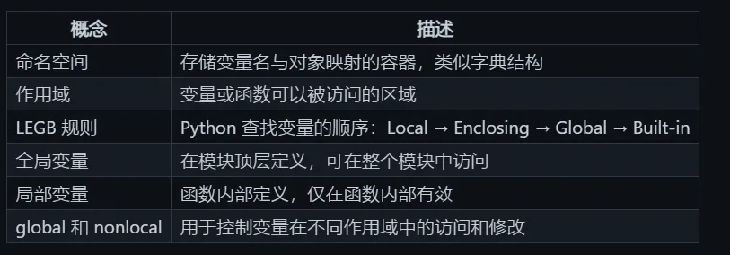 ```pythonx = "global" # 全局变量def outer(): x = "enclosing" # 封闭变量 def inner(): x = "local" # 局部变量 print(x) # 输出 local inner() print(x) # 输出 enclosingouter()print(x) # 输出 global```