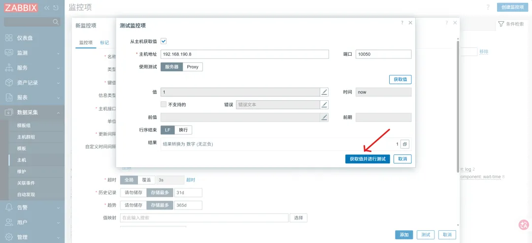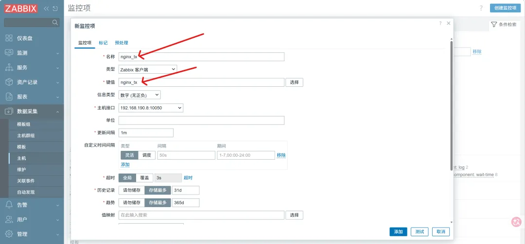 #测试自定义的监控项(被监控主机上执行)systemctl restart zabbix-agent2zabbix_agent2 -t nginx_tx[root@rocky ~]# zabbix_agent2 -t nginx_txnginx_tx [s|1]