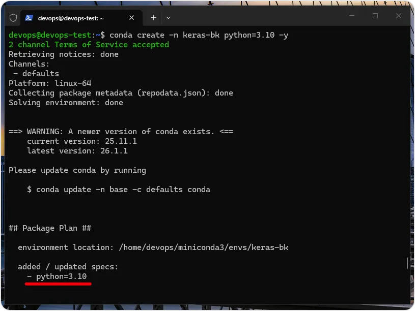 在 Miniconda 是使用 conda 命令来建立、启动、删除与管理 Python 虚拟环境。我们准备建立名为 keras-bk 的虚拟环境,请启动 Windows 终端机启动、进入和切换至 Linux 用户目录后,输入 conda create 命令来建立虚拟环境,如下所示:$ conda create -n keras-bk python=3.10 -y