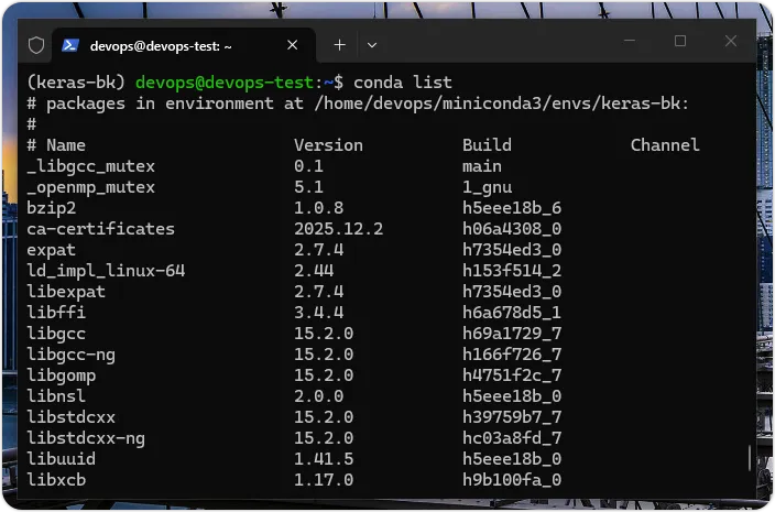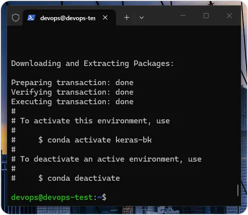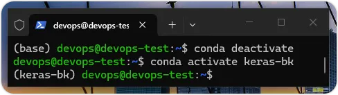 当成功建立 keras-bk 虚拟环境后,使用虚拟环境需要使用 conda activate 命令启动虚拟环境,在命令最后是虚拟环境名称 keras-bk,如下所示:$ conda activate keras-bk