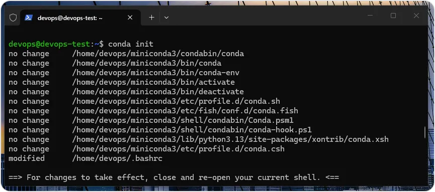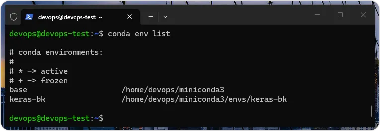 上述命令的 -n 选项(或使用 --name 选项)指定虚拟环境名称 keras-bk,python= 选项指定 Python 版本是 3.10 版,其执行结果在显示套件计划(Package Plan)和虚拟环境路径后,开始建立虚拟环境,如下图所示:请耐心等待,等到完成建立后,就可以在最后显示启动 keras-bk 虚拟环境的命令说明,如下图所示:当成功建立虚拟环境后,我们需要输入 conda init 命令来初始化环境,在完成后记得需要重新启动 Windows 终端机,如下所示:请重新启动 Windows 终端机,输入 wsl 和 cd ~ 命令进入 Linux 子系统的用户目录,可以看到位于用户名前的(base),这是基底的 Python 虚拟环境(预设环境),请输入 conda env list 命令显示已建立的虚拟环境清单,如下所示:上述清单的 base 就是预设环境,可以看到新增的 keras-bk 虚拟环境。启动与使用 Python 虚拟环境