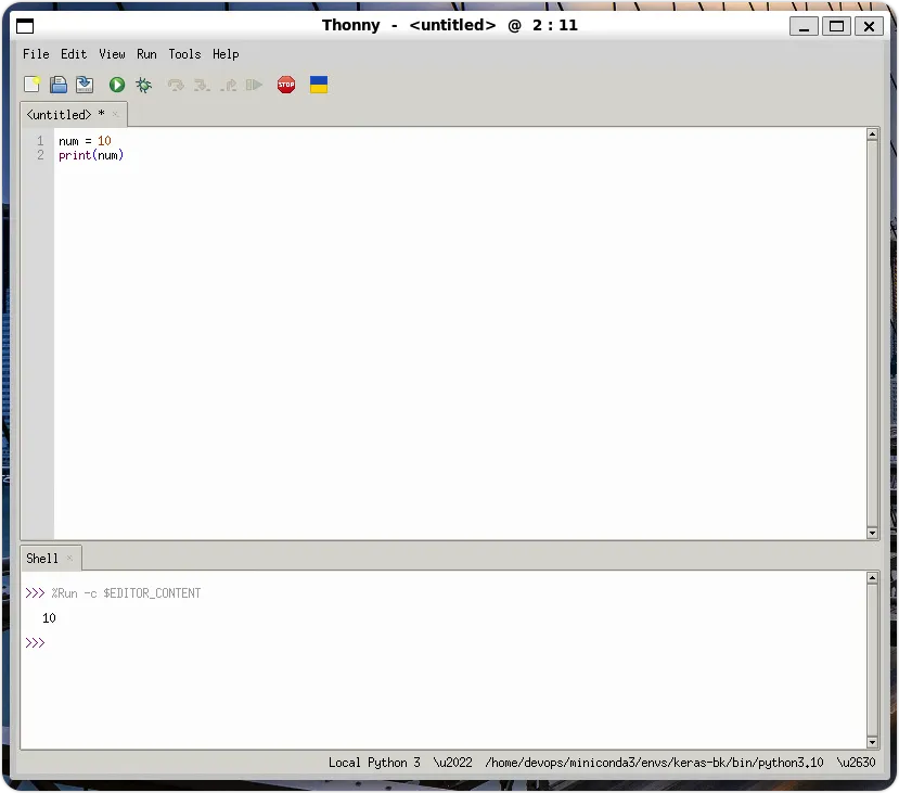 然后,请使用 thonny 命令启动 Thonny IDE,第 1 次启动需要设定语言与初始设定,不用更改,请按【Let's go!】继续。然后,就可以在标签页 输入下列 Python 代码,如下所示:请按 【 F5 】 键或「Run > Run current script」命令,就可在下方「Shell」窗格显示 Python 程序的执行结果 10。关闭与移除 Python 虚拟环境