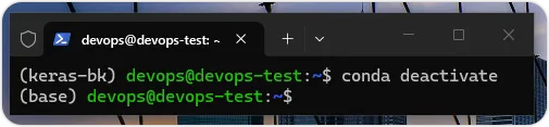 上述命令可以关闭 keras-bk 虚拟环境回到 (base),如下图所示:在 Miniconda 移除 Python 虚拟环境的命令是 conda env remove,如下所示:(base) $ conda env remove --name keras-bk