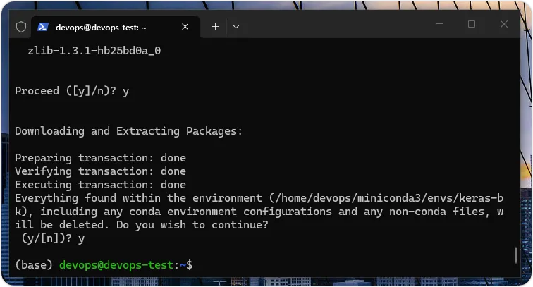 上述命令的 --name 选项(或 -n 选项)是移除的 Python 虚拟环境名,以此例是 keras-bk,需要输入 y 键确认,如下图所示: