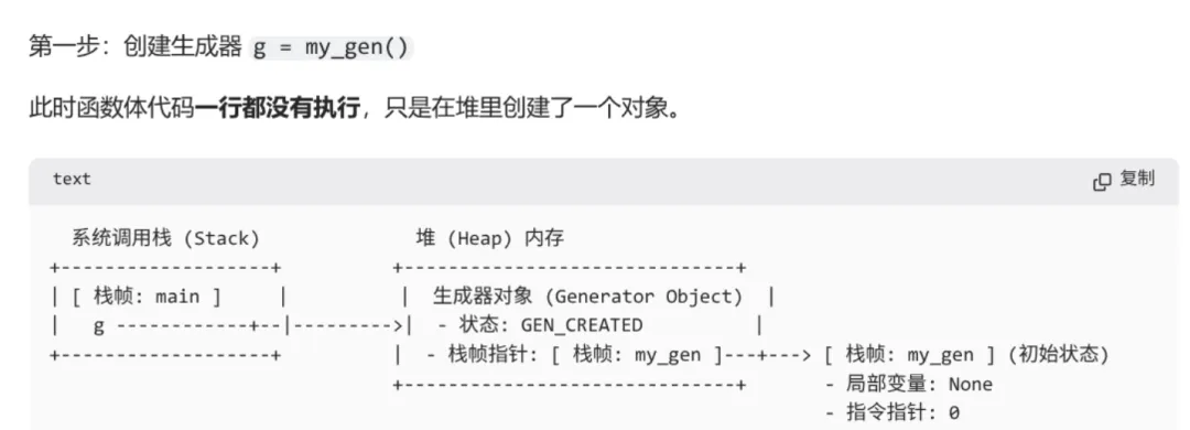 simple_generator() 时,并不会执行函数体内的代码,而是直接返回一个生成器对象。这个生成器对象内部包装了一个堆(Heap)上分配的栈帧。