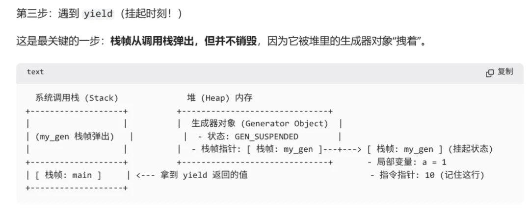 yield 切割,转化成了一个状态机。局部变量变成了状态机的内部状态,yield 变成了状态转移的触发器。 - 从底层实现看:CPython 通过将栈帧对象(Frame Object)保存在堆内存中,而不是在函数返回时销毁它,从而实现了执行上下文的保存和恢复。指令指针(