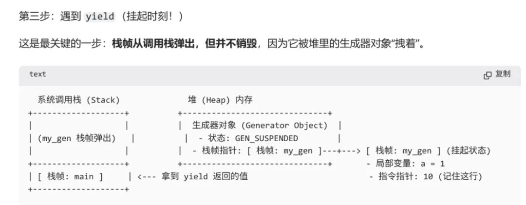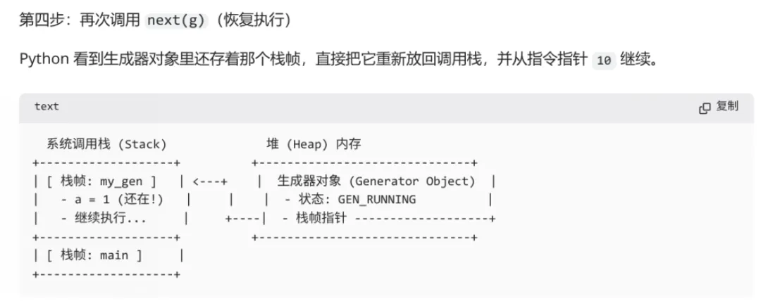 next(gen) 时,解释器找到之前保存的那个栈帧,重新推入执行栈,并从上次记录的指令指针处继续往下执行。