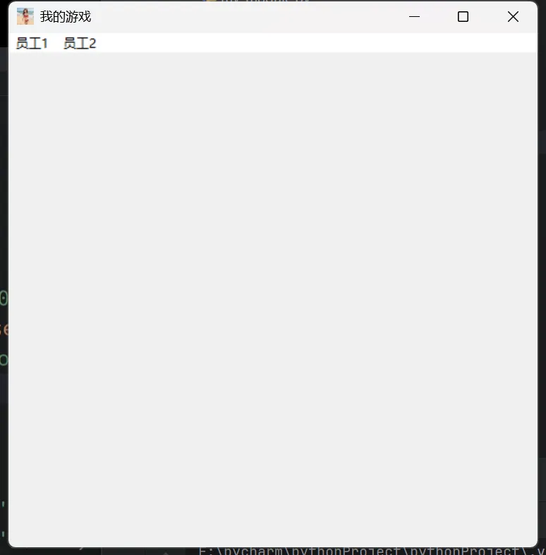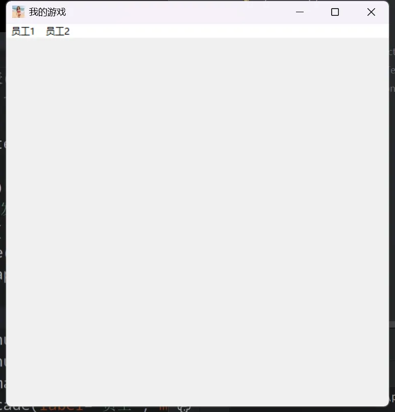 # 创建主菜单# 设置菜单名# 开启菜单栏import tkinter as tka1 = tk.Tk()a1.title('我的游戏')a1.geometry('500x500+400+200')a1.resizable(True, True)a1.iconbitmap('logo1.ico')# 创建主菜单cai = tk.Menu(a1)# 设置菜单名cai.add_cascade(label='员工1')cai.add_cascade(label='员工2')# 开启菜单栏a1.config(menu=cai)a1.mainloop()